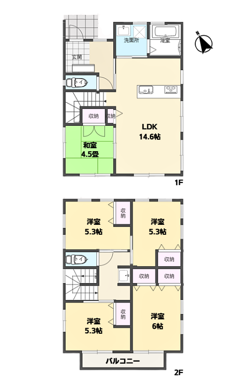 和室 4.5畳 LDK 10.8畳 洋室 6畳 洋室 5.3畳 洋室 5.3畳 洋室 5.3畳 |